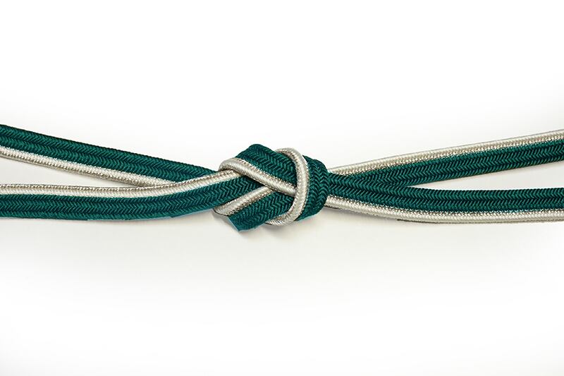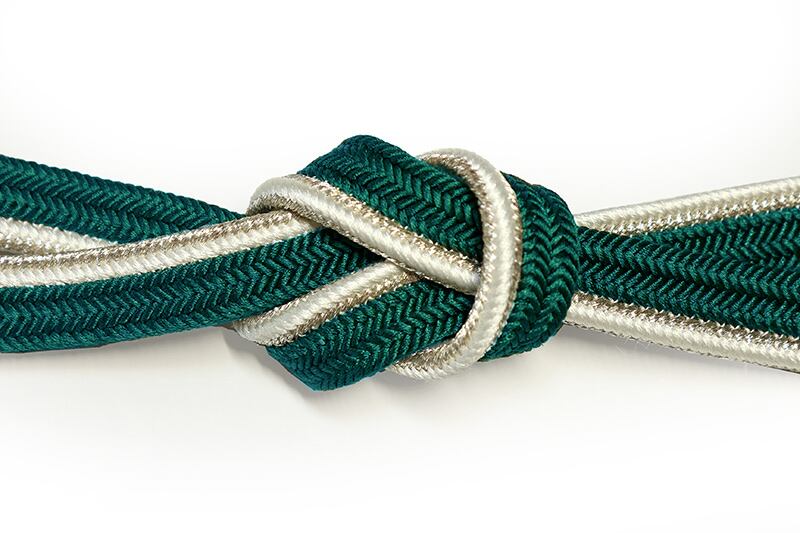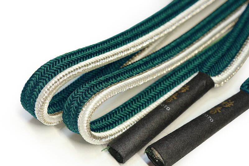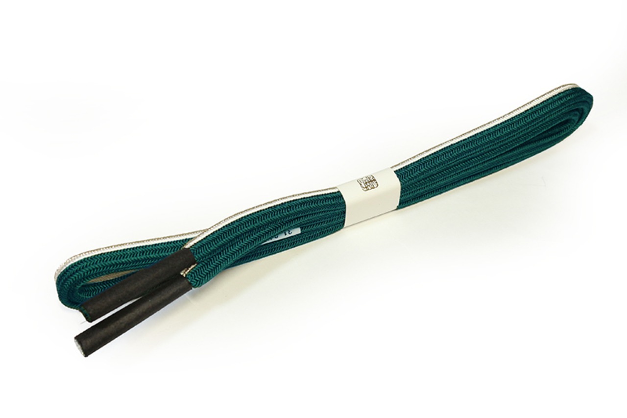 日本製の上品な正絹帯締です。濃い緑の無地で端に白と金のラインを入れて組んだ帯締です。適度な固さがあり型が付けやすい風合いです。また、スッキリしたデザインで、小紋や紬などの洒落ものや付下、色無地などの準フォーマルにもキリっと合わせていただけます。