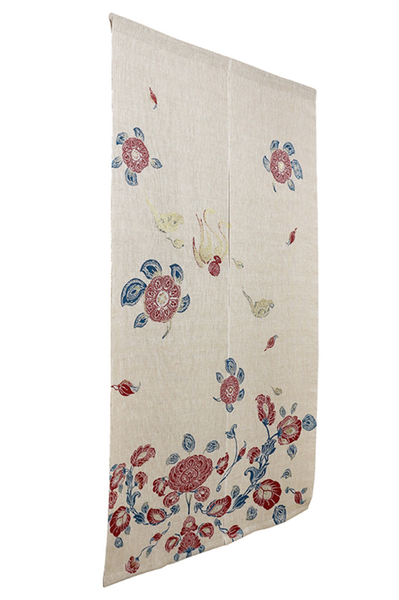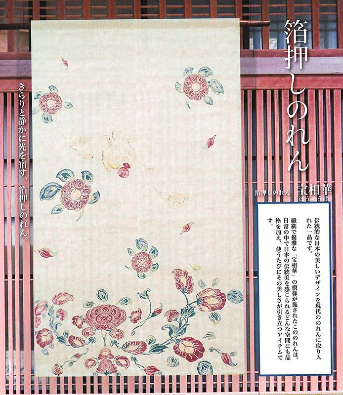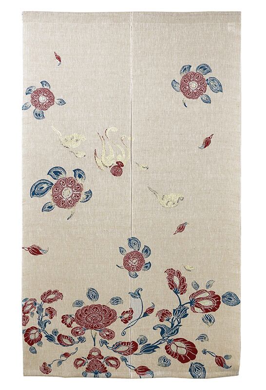 伝統的な日本のデザインを現代ののれんに取り入れた一品です。繊細で優雅な「宝相華」の模様が施されたこののれんは、日常の中で日本の伝統美を感じられるどんな空間にも品格を加え、使うたびにその美しさが引き立つアイテムです。ジュート・麻の素材にさりげなくキラリと光る箔押しがアクセントになっています。