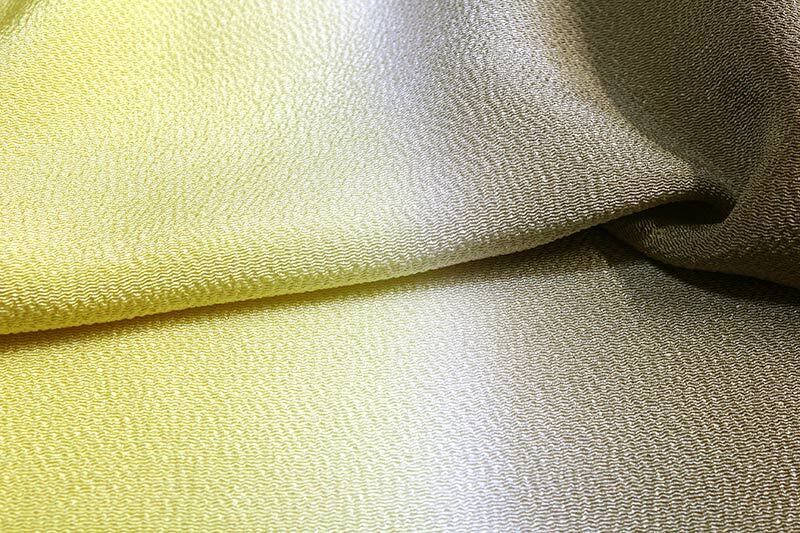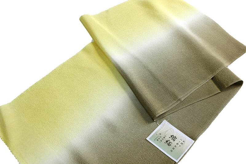 京都丹後の絹100%帯揚げです。水撚り八丁撚糸を使用した縮緬地で光沢があり、大変しなやかでドレープ性と弾力性がある生地です。黄色と利休茶のたてぼかしの染め分けになっており、上品なな印象です。きものと帯によって2色を使い分けることができ、フォーマルでもカジュアルでもご使用いただけます。