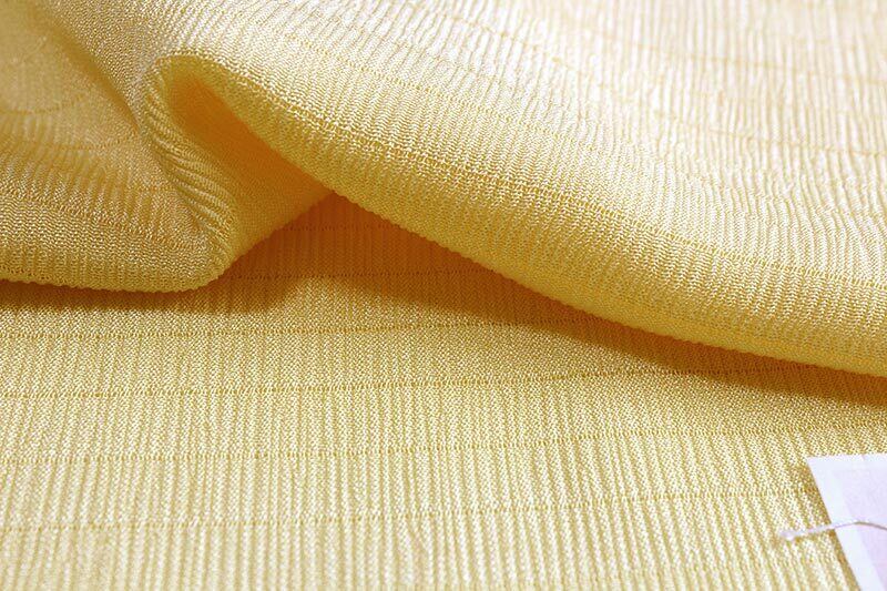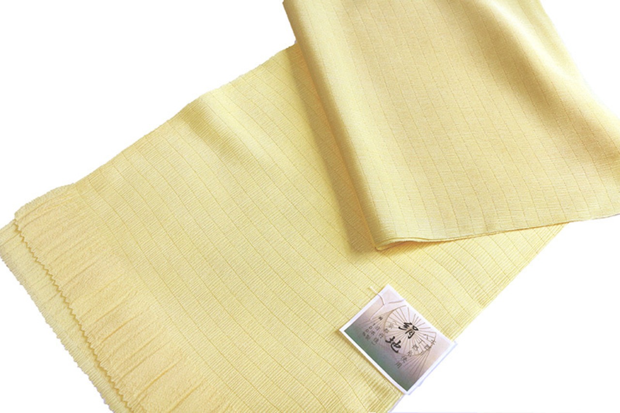 京都丹後の絹100%夏物帯揚げです。水撚り八丁撚糸を使用した絹地(きんち)でたてシボで絽の生地を無地染めしてあります。絹独特の光沢があり、大変しなやかでドレープ性と弾力性がある生地です。色は淡い黄色の無地染めで、大変上品な印象です。コーディネイトできものと帯の邪魔をしない非常にやさしい色目ですのでフォーマルでもカジュアルでもご使用いただけます。