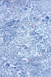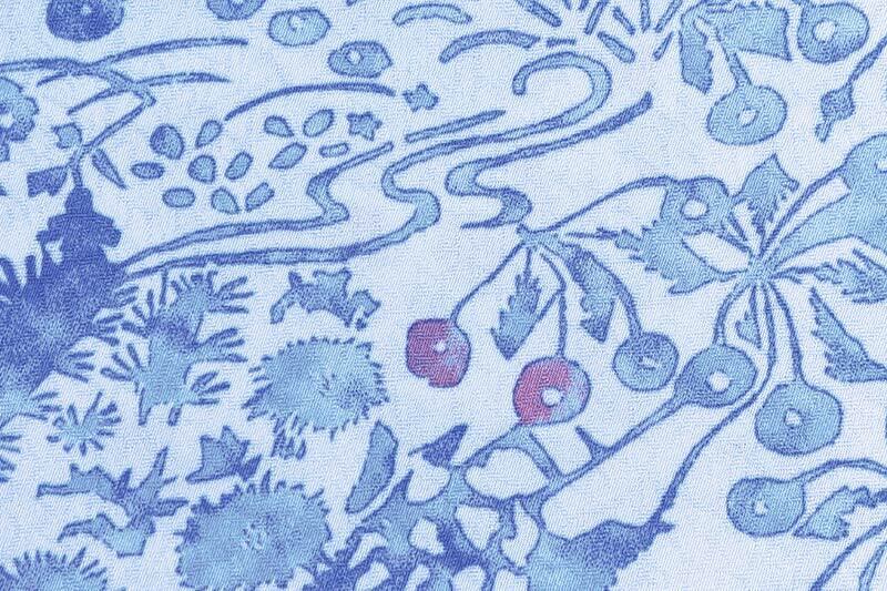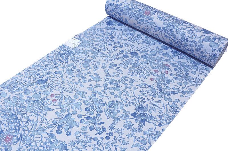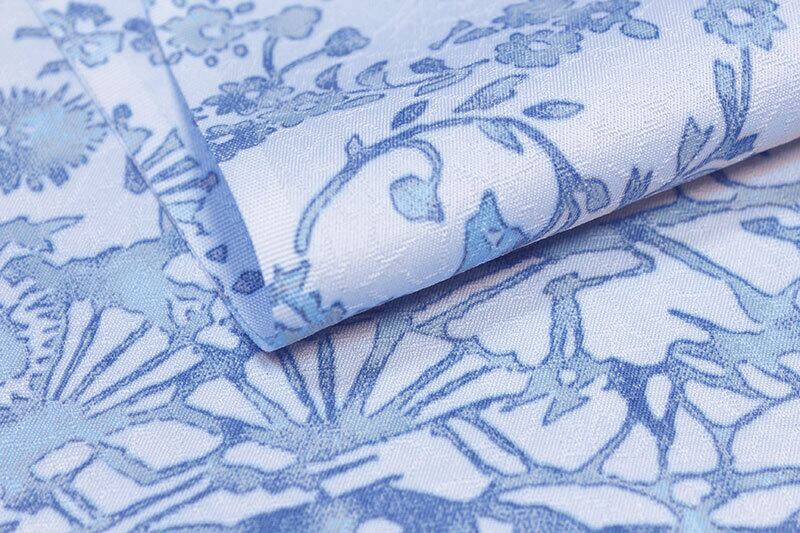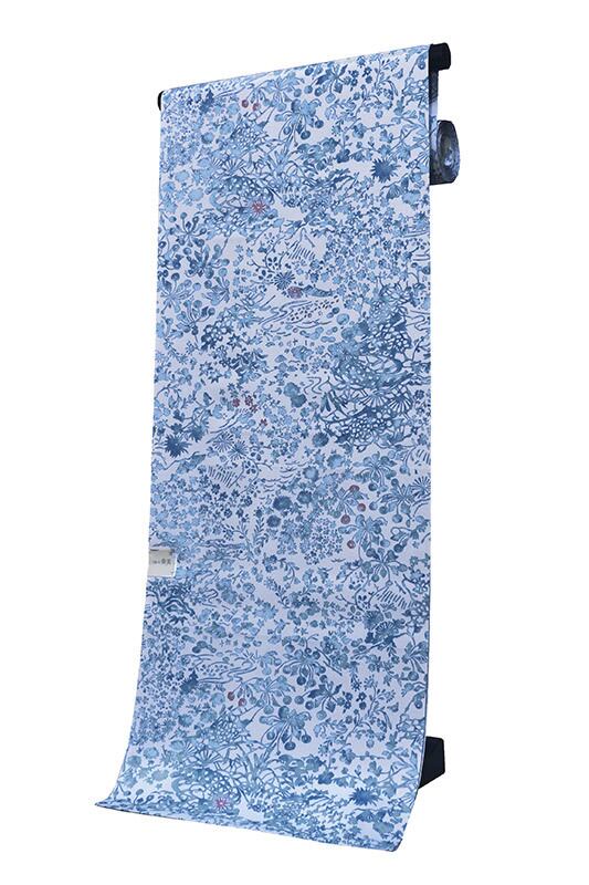 東レシルックの洗える小紋です。藍染風のブルー濃淡で草花文様を全体に描いたお洒落小紋です。シンプルな色使いは年齢層も広く、帯も合わせやすい柄です。生地は東レシルック50周年記念新素材の「奏美」で、従来の生地に比べて10~15%の軽量化がされており、優れた制電性による快適な着心地とイージーケアが特徴です。紋意匠でしなやかですが厚みもありしっかりした風合いで、袷はもちろん単衣にも適した生地です。