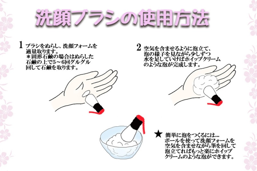 日本有数の筆作りの都、広島県熊野町の「熊野筆」を手掛ける匠が一つ一つ作り上げた、形・毛質にこだわり仕上げた逸品です。 この商品はヤギ毛の極細を使用することで、よりクリーミーな泡が立てられ、毛先をお肌に垂直に立てて(3日に一度程度)洗顔いただきますと、毛穴の汚れを取り除いてくれます。使い方はまず初日は、2~3分ぬるま湯に毛先を浸けて毛を完全に濡らします、水をきらずに手のひらに用意していただいた洗顔フォームや石鹸を抹茶立てるようにして、泡立てをしてください。できたクリーミーな泡で摩擦がないように洗顔してください。毛先を、立ててブラシでお洗いになることもできますが、この場合は、3日に1度程度にしてください。毛穴が綺麗になりますが、毎日この方法でお洗いになると脂が取れすぎ、肌荒れの原因になります。ブラシを使って毎日洗顔する場合は、毛先を肌に当てず立てた泡をクッションにしてお使いください。お勧めはブラシで立てた泡を使いてのひらで洗顔、3日に1度、毛先を使った洗顔が理想と感じております。もちろん男性用の髭剃り様に泡立てにもお使いいただけます。