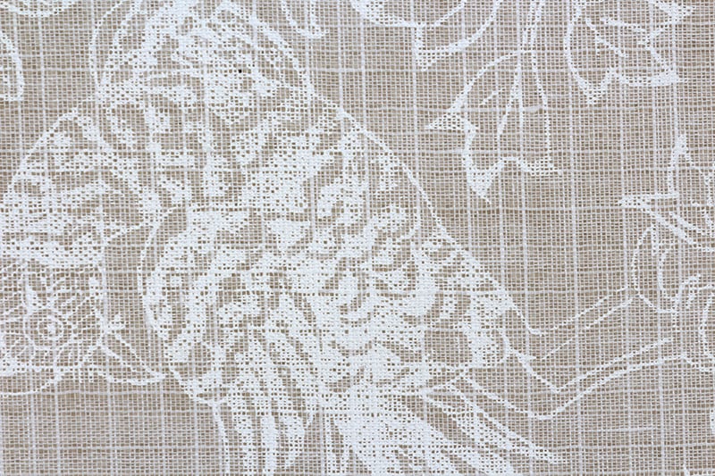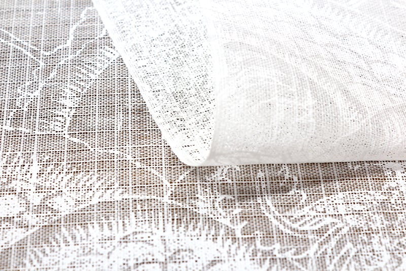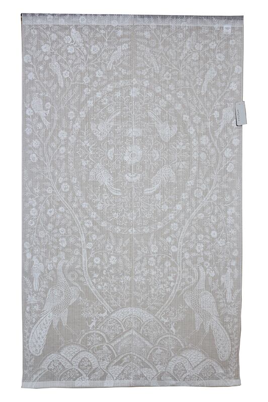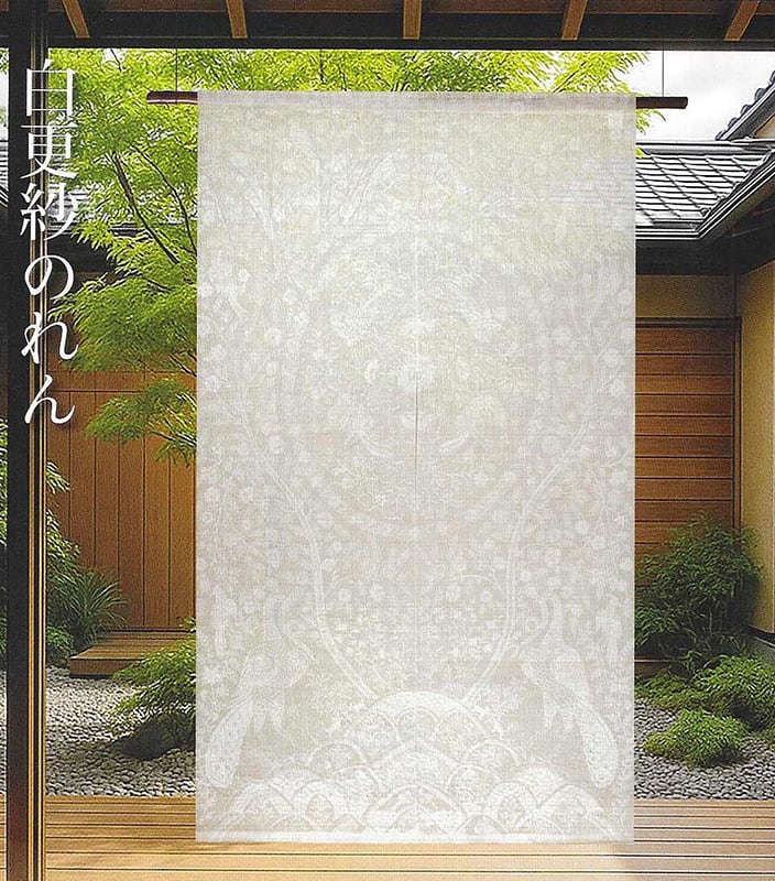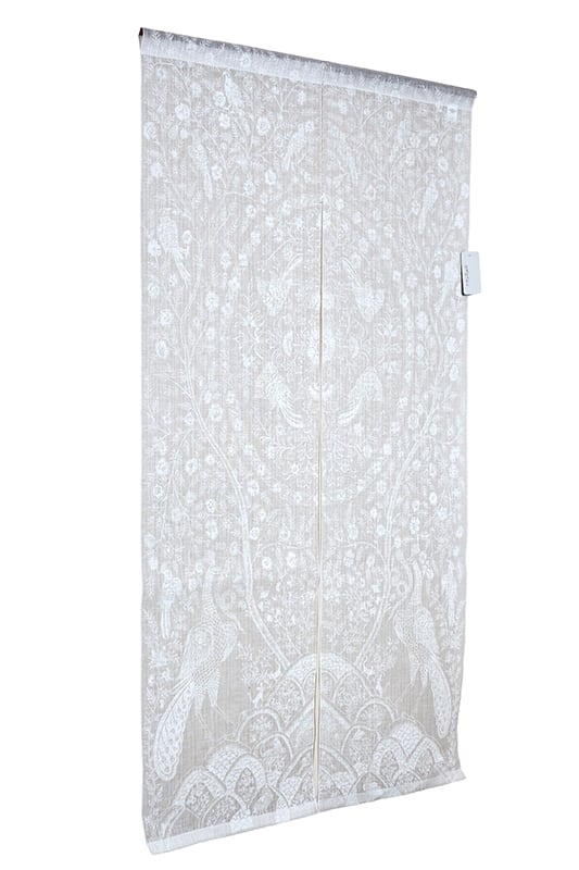 白地に繊細な文様を染め上げた白更紗のれん。更紗特有のきめ細やかな雰囲気とフランスらしい洗練されたモチーフが溶け合い、上品で華やかな世界観を生み出しています。職人が一枚一枚型を置き手仕事で仕上げたこだわりの一枚です。白更紗の文様は距離によって表情を変えるのも魅力です。近くで見ると繊細さが際立ち、離れて見ると模様がひとつのリズムとなって空間を軽やかに包み込みます。