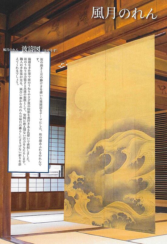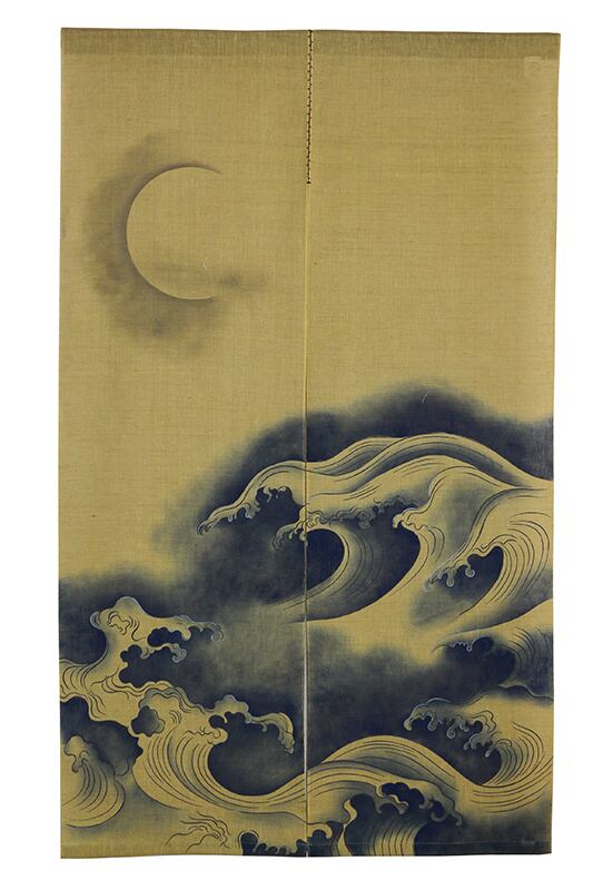 波の動きと月の静けさを描いた波濤図をテーマにした和の趣あふれるのれんです。