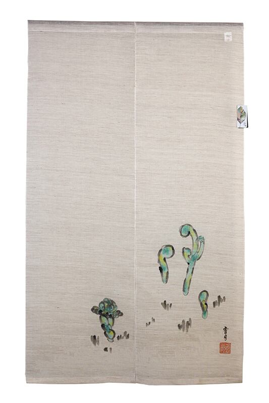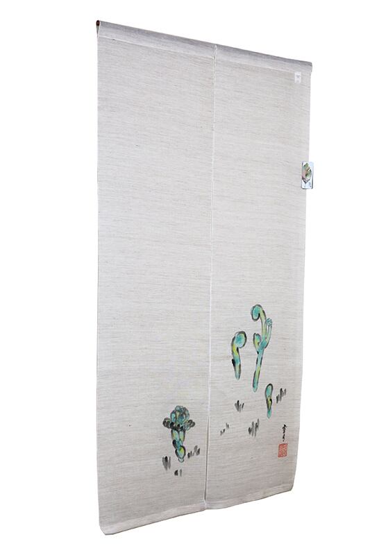 手描きならではの柔らかな線と淡い色合いが美しいのれんです。水彩画のように優しくにじむタッチが空間に涼やかさを演出します。生地にはほのかに透け感のある素材を使用し、光をふんわりと通し、掛けるだけで軽やかな雰囲気を演出します。暮らしにそっと吉祥を添える一枚です。