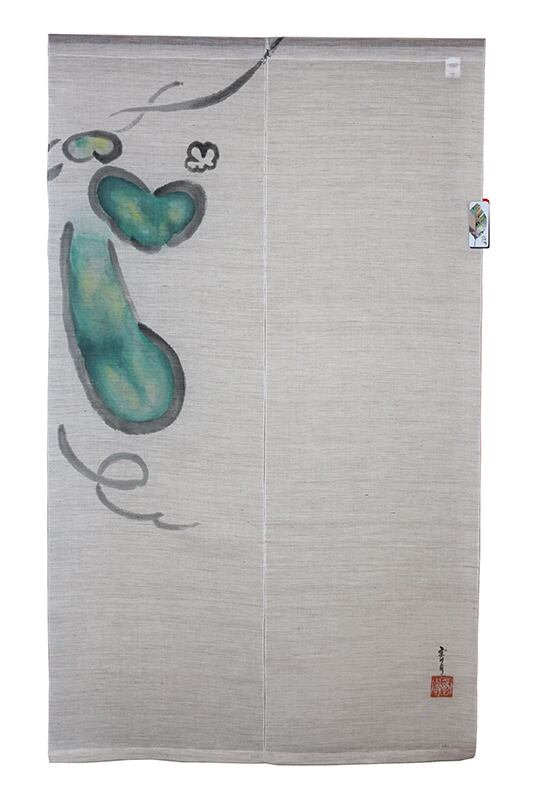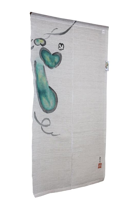 手描きならではの柔らかな線と淡い色合いが美しいのれんです。水彩画のように優しくにじむタッチが空間に涼やかさを演出します。生地にはほのかに透け感のある素材を使用し、光をふんわりと通し、掛けるだけで軽やかな雰囲気を演出します。暮らしにそっと吉祥を添える一枚です。