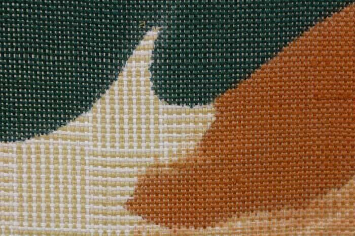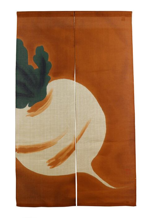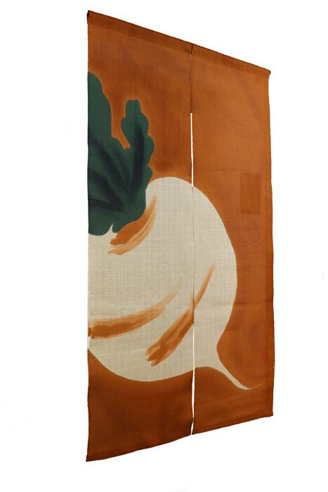 「株が上がる」にちなんで出世運のあるものと言われ、縁起物とされてきた蕪(かぶら)を柿色を背景に大きく大胆に手染めで描いた縁起と愛嬌どちらも持ち合わせた麻のれんです。