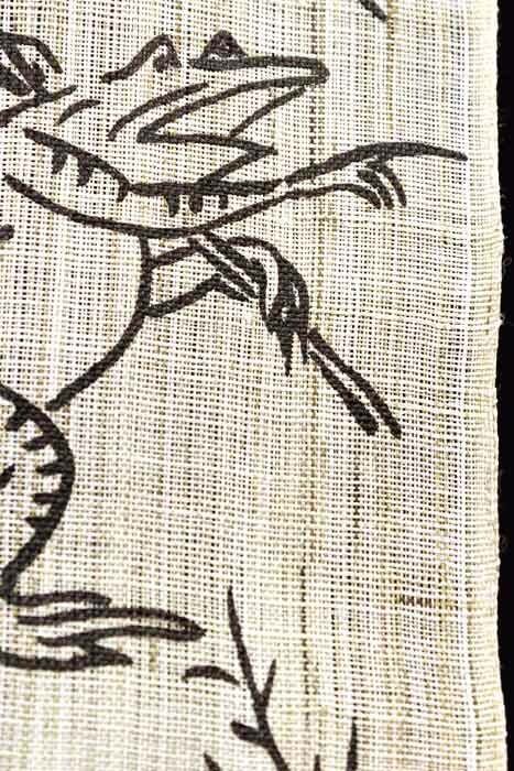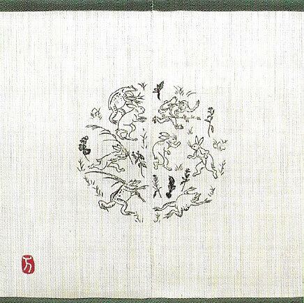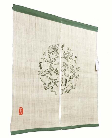 現代でも人気の鳥獣戯画をモチーフにした麻のれんです。上下が緑の縁取りで、春の七草に戯れるウサギ、カエル、サルたちが駆け回ったり寝転んだりする姿は「わいわい」と題され、心を癒してくれるデザインです。
