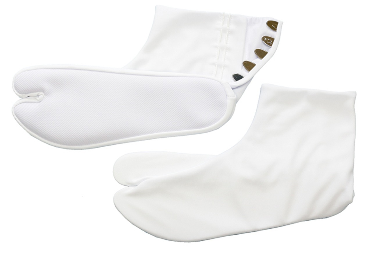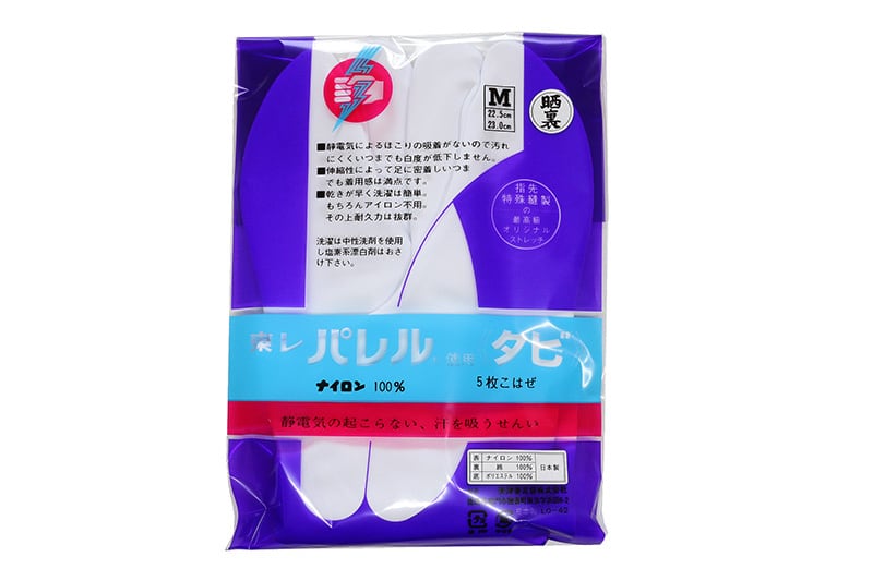 表地に静電気の起こりにくい繊維、東レパレルを使用した5枚こはぜの白足袋です。静電気によるほこりの吸着がないので汚れにくくいつまでも白度が低下しません。吸汗性もよく伸縮性によって足にピッタリフィットし、一年中爽やかに着用していただけます。裏地は晒(綿)で優しい肌触りです。また、シワ・縮み・型崩れが少なく洗濯も簡単。その上アイロンは不要でお手入れも簡単です。