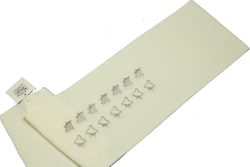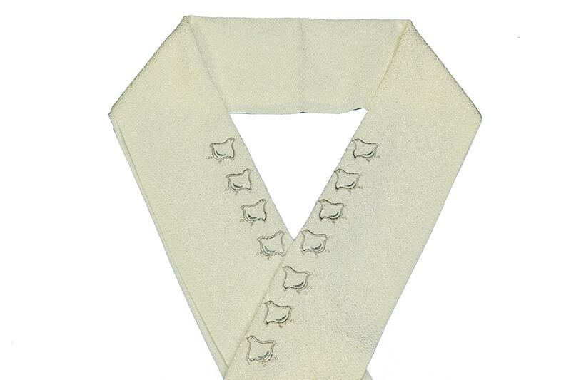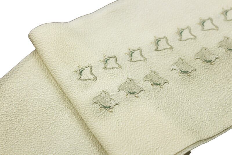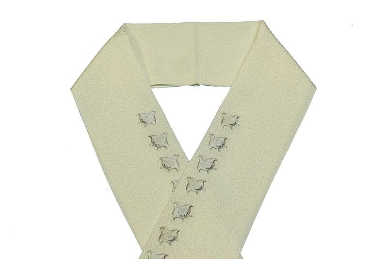 ポリエステルのポップな刺繍半衿です。オフホワイトの縮緬地に銀の千鳥柄の刺繍で衿元のアクセントになります。千鳥の色が銀と白抜きがありどちらでも使えます。