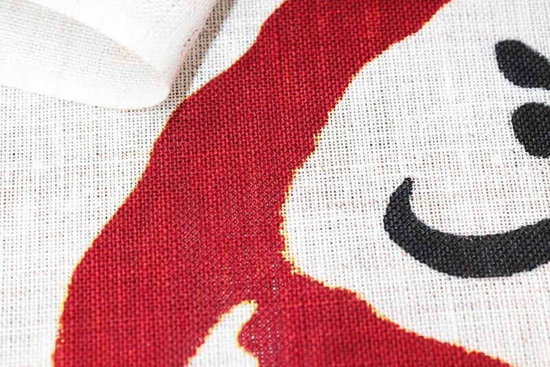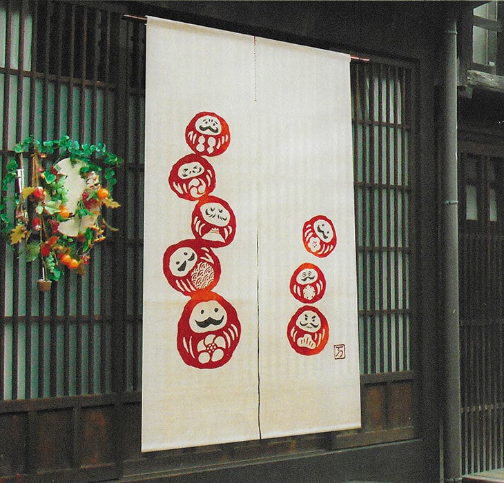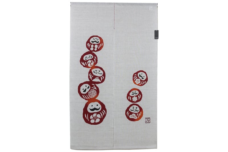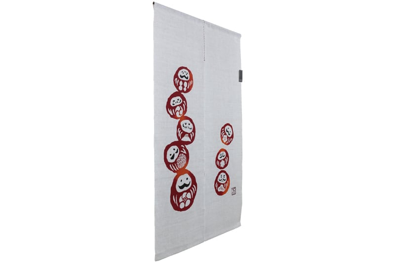 めげずに起き上がる達磨。七転八起の一回目の起き上がりは人が生まれてから歩けるようになるまでとされています。「初めからできることはなく少しずつできるようになる」無病息災の意味を持つ赤いだるま達がそんな想いを伝えてくれるかのようです。飾って縁起のいい、見て心が晴れるのれんです。注染(ちゅうせん)という染技法は型で防染糊を生地に置き、生地を畳んでまた型で糊を置く。それを何度も繰り返し、束になった生地に染料を注ぎ込み、一気に染め上げる技法で、裏表がなくぼかしもきれいに表現され、現在でも浴衣や手ぬぐいなどに用いられている技法です。