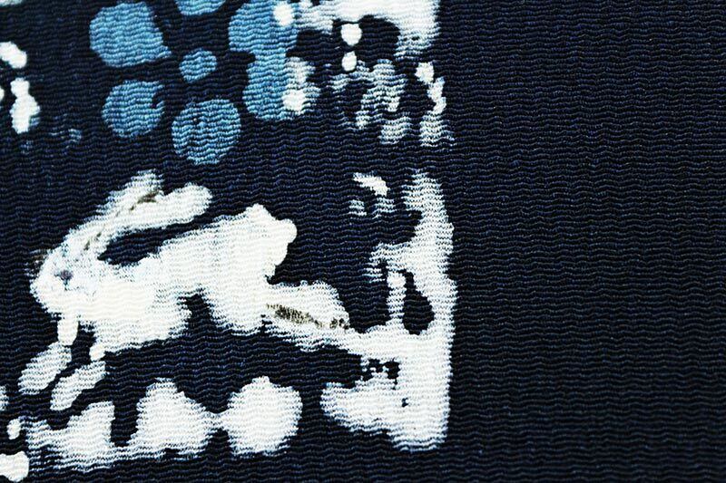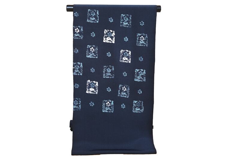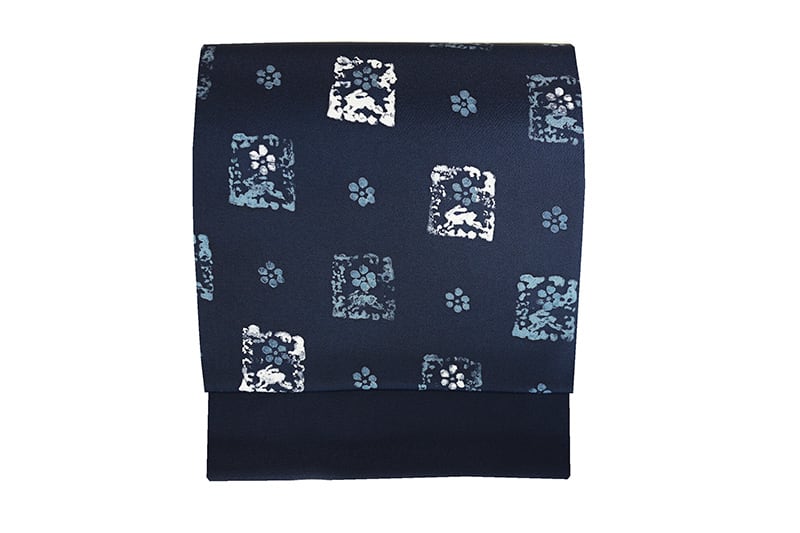 ろうけつ染めの正絹九寸名古屋染帯です。シボのある縮緬の生地で紺の地色にろうけつ染めで花兎を描いた趣きのあるデザインです。小紋や紬などのしゃれものに、また袷と単衣のシーズンに締めていただけます。未仕立ですので、お仕立て希望の方は加工より「九寸帯仕立」を同時にご購入下さい。