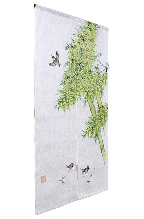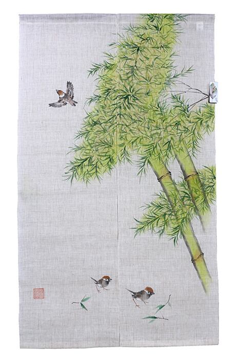 常緑で、根を深く広く張る竹と雀の組み合わせは「子孫繁栄」や「一族の繁栄」を表すと言われます。「雀は鳳凰の雛である」そんな言い伝えもあり、鳳凰は人を良く見て祝福を与えると言います。厄を取り払って祝福を与えてくれる「竹に雀」を職人による手描きで大胆に描いたのれんです。