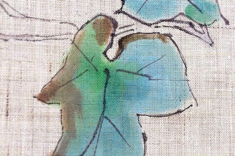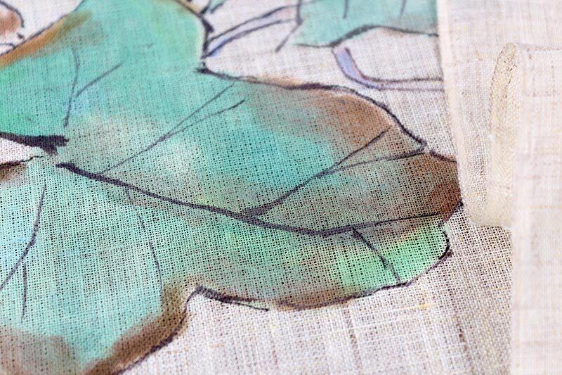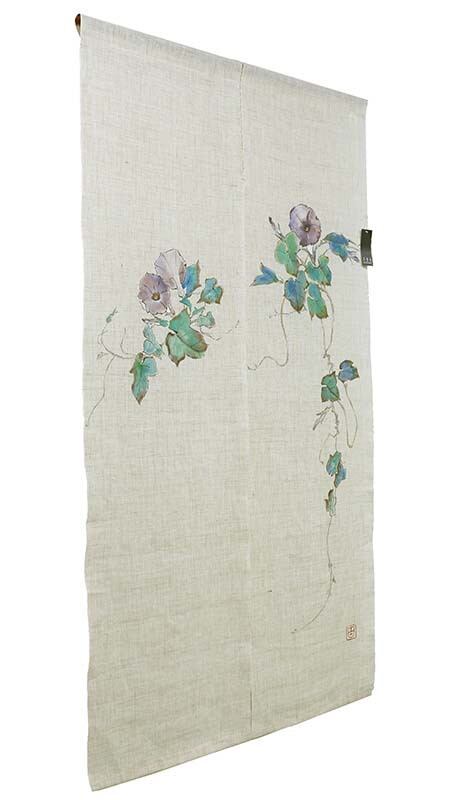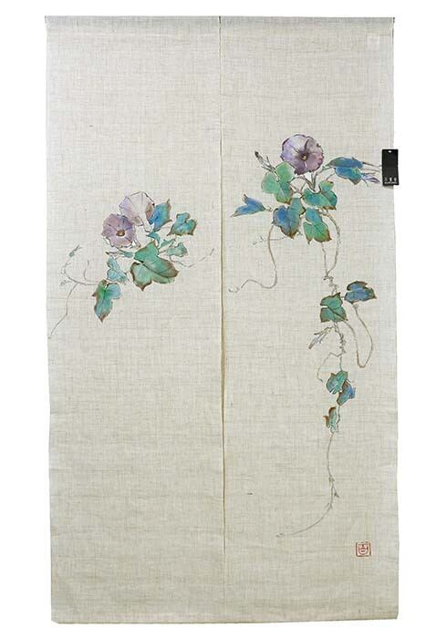 朝顔は江戸時代に七夕の頃に咲くことから織姫と彦星が出会えたことを知らせる花として人々から愛されてきました。幸せを知らせる花は見る人々に喜びと幸福を与えてくれます。その朝顔を描く対象物を輪郭線でくくり、その内側を彩色していく鈎勒描き(こうろくがき)という方法で職人が描いたのれんです。