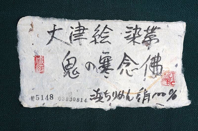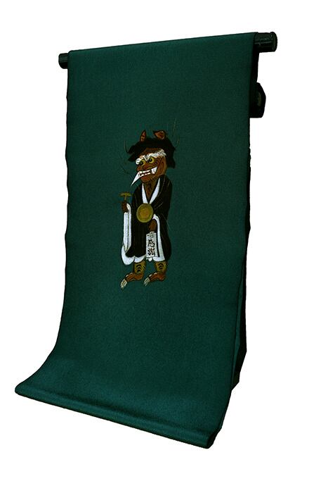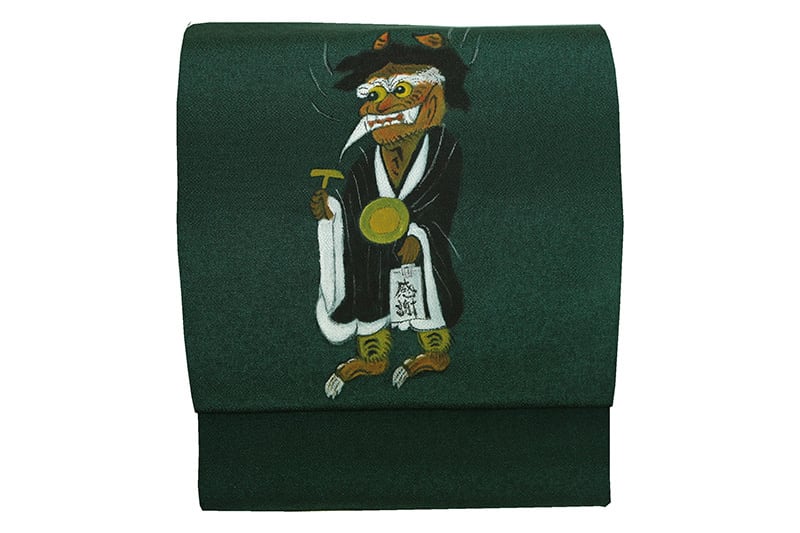 手描き友禅の正絹九寸名古屋染帯です。浜ちりめんの生地でグリーンの地色に大津絵の鬼が寒念佛を唱える姿を手描き友禅で描いたインパクトのあるデザインです。江戸時代に東海道大津宿の名物となった大津絵の鬼をモチーフにどこかユーモラスで郷愁を覚える雰囲気があり、小紋や紬などのしゃれものに、また袷と単衣のシーズンに締めていただけます。未仕立ですので、お仕立て希望の方は加工より「九寸帯仕立」を同時にご購入下さい。